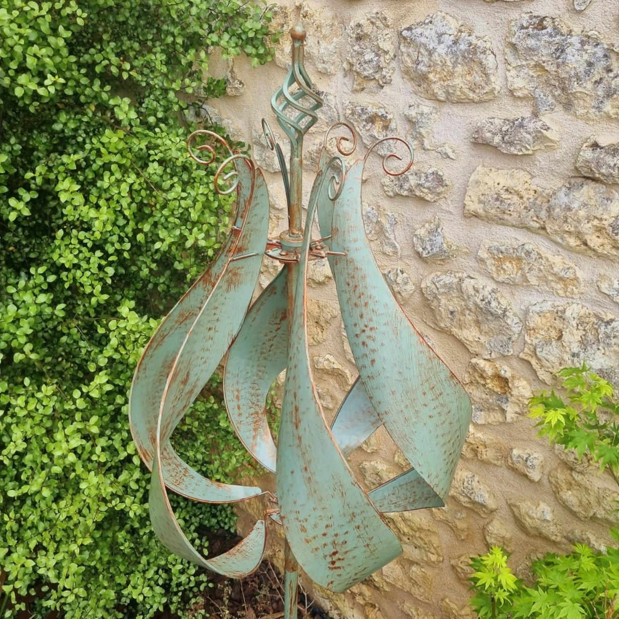 Prachtige en moderne, zal deze decoratieve tuinwindmolen CHEVERNY in groen/verouderd goud uw hart veroveren. Van het type Savonius start onze tuinmobiel al bij een lichte wind. Uitgerust met 4 afgedichte lagers is deze metalen tuindecoratie zeer duurzaam. Ontdek ook ons model OLÉRON