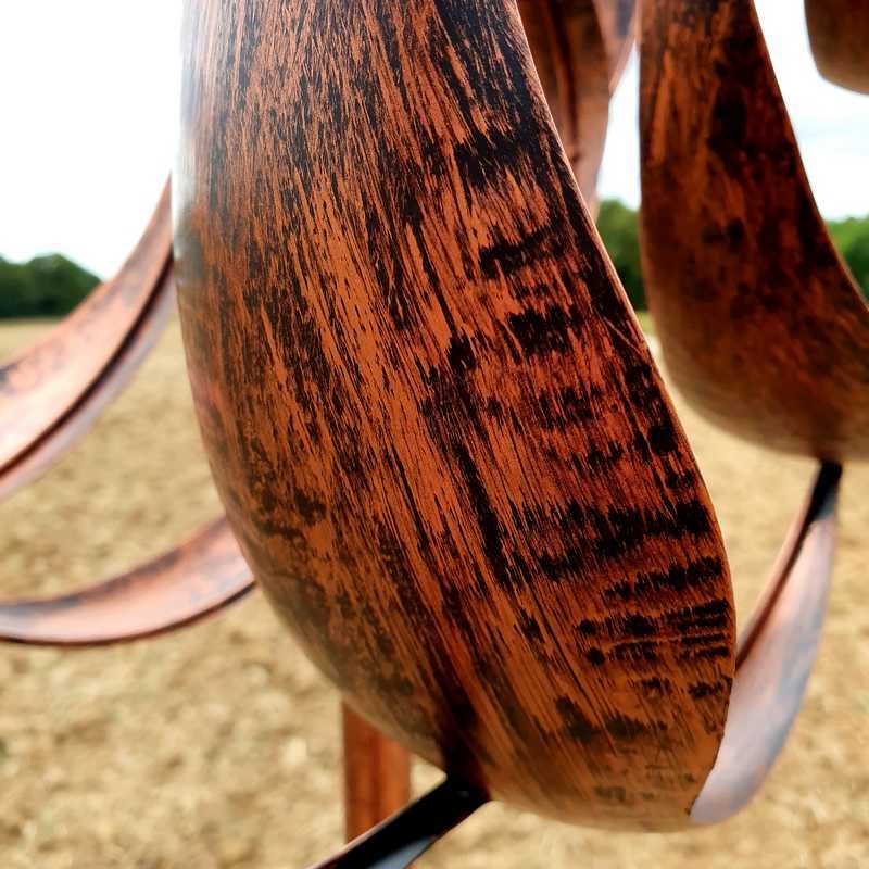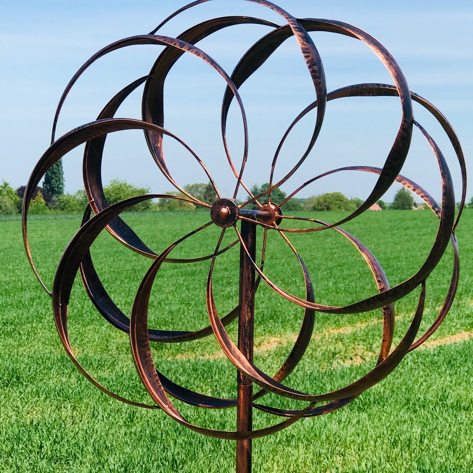Ontworpen om lang mee te gaan, is deze exclusieve tuinwindmolen gemaakt van stevig metaal, behandeld met een gepatineerde koperen coating die natuurlijke bescherming biedt tegen invloeden van buitenaf.