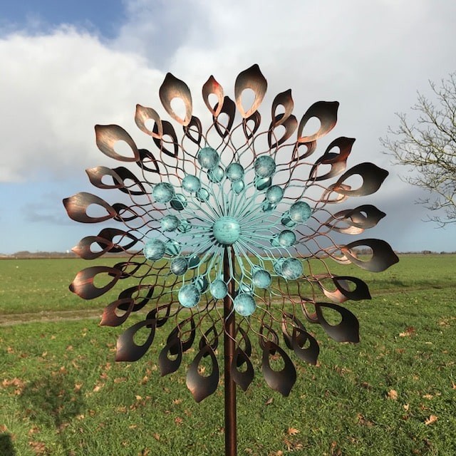 Con su eje horizontal, este molino giratorio se orienta naturalmente hacia el viento, ofreciendo tanto un espectáculo relajante como una indicación práctica de la dirección del viento. Sus palas con tonos cobrizos y envejecidos juegan con la luz, creando un efecto visual único que se adapta a todos los estilos de jardín.
