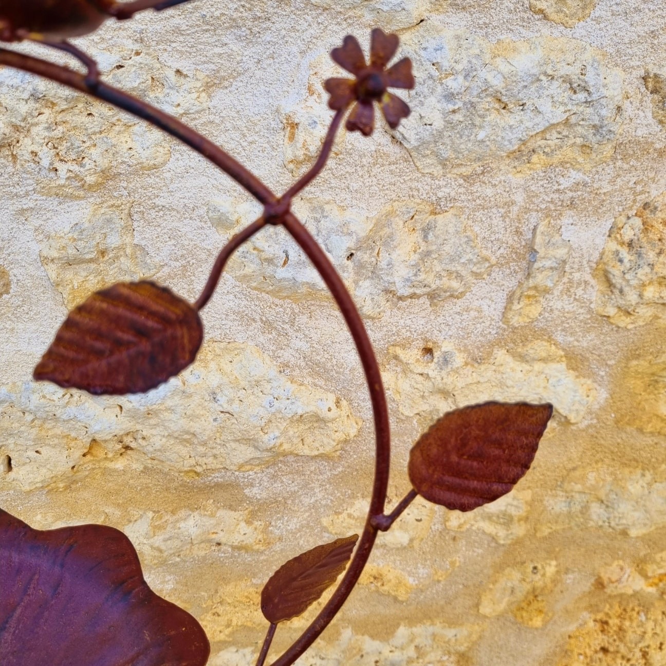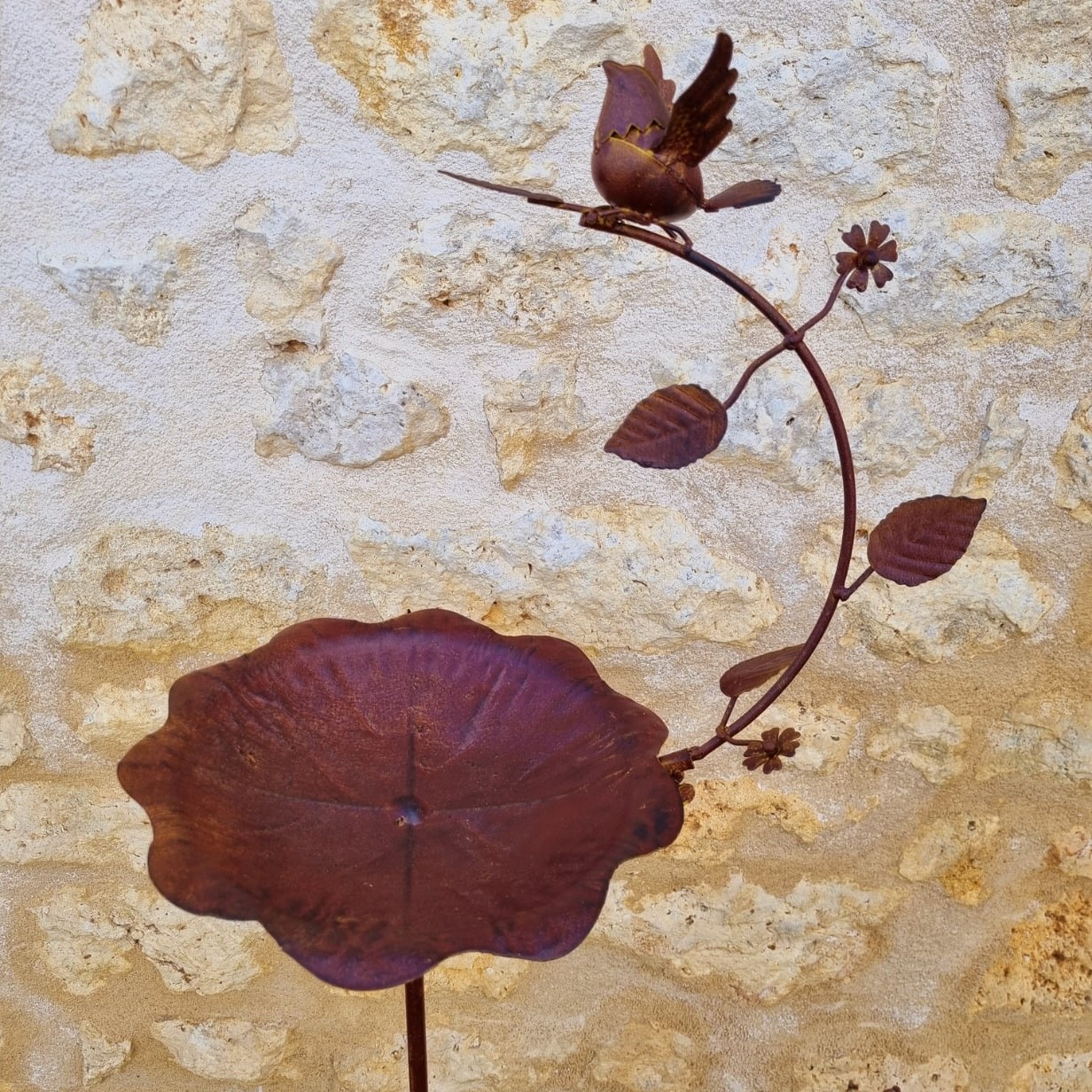 De schaal in de vorm van een blad, praktisch en esthetisch, maakt het poëtische ontwerp helemaal af. Geplaatst op een fijne steel met een stabiele vorkpen, kan dit vogelbad eenvoudig in de grond worden gestoken en biedt het optimale stabiliteit, zelfs op winderige plekken. De afwerking met roestkleurige verf geeft dit product een warme en tijdloze uitstraling die perfect past bij elke buiteninrichting.